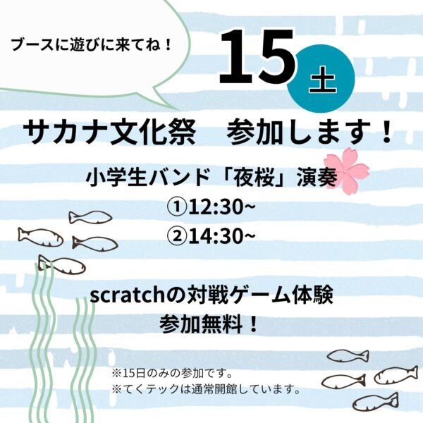 📣サカナ文化祭に参加します! 11月15日(土)のみの参加です!ぜひ遊びに来てください✨ 🌸小学生バンド「夜桜」演奏 ①12:30~ ②14:30~ てくテックブースでの演奏 […]