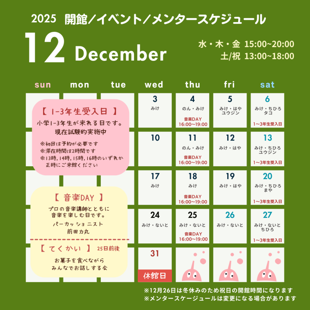 【🎄12月のカレンダー】 2025.11.30 お知らせ ●1〜3年生受け入れ日(試験的実施) 毎週土曜日 13:00〜17:00 1年生〜3年生もデジタルものづくりを楽しもう♪ ※初回は予約が必要です 予約フォームはこちら ※滞在時間は最大で2時間です ※13時,14時,15時,16時のいずれか正時にご来館ください ●音楽DAY 毎週木曜日 16:00〜19:00 プロのパーカッショニストと音楽を楽しもう♪ ●てくかい 25日前後(当日の人数や様子によって変動します) お菓子を食べながらみんなでお話しする会