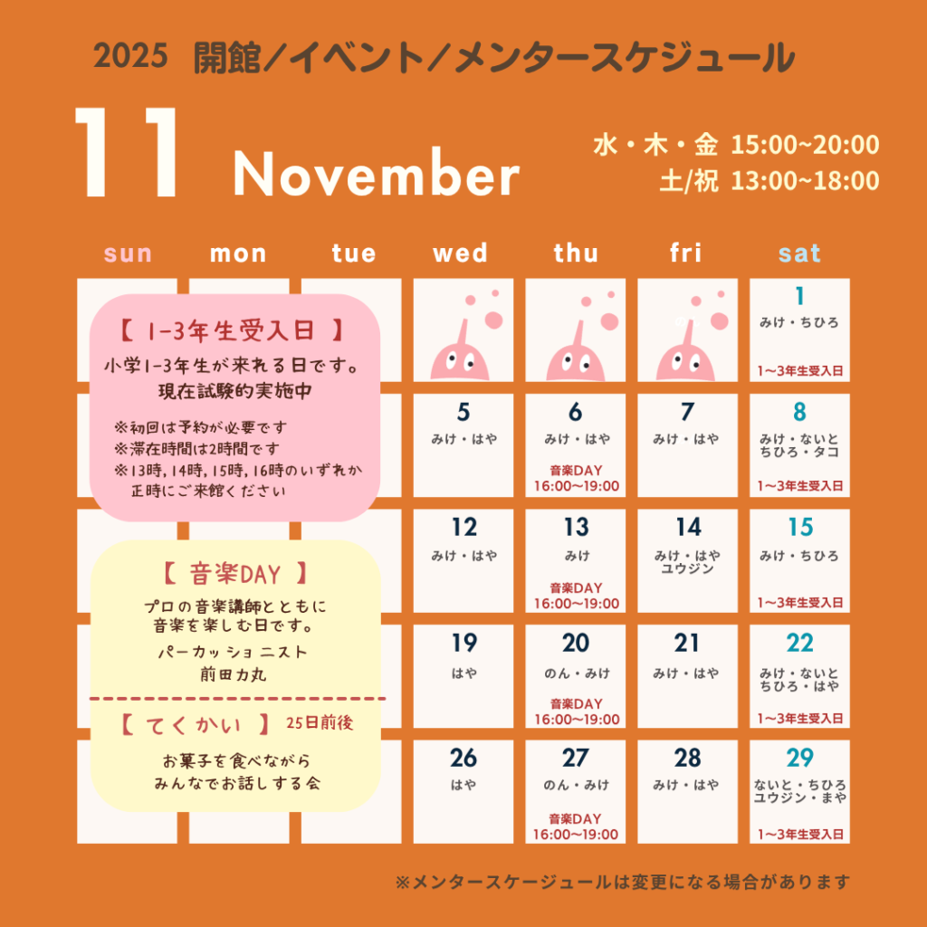 【11月のカレンダー🍂】 2025.10.31 お知らせ ●1〜3年生受け入れ日(試験的実施) 毎週土曜日 13:00〜17:00 1年生〜3年生もデジタルものづくりを楽しもう♪ ※初回は予約が必要です(予約はこちらより) ※滞在時間は最大で2時間です ※13時,14時,15時,16時のいずれか正時にご来館ください ●音楽DAY 毎週木曜日 16:00〜19:00 プロのパーカッショニストと音楽を楽しもう♪ ●てくかい 25日前後(当日の人数や様子によって変動します) お菓子を食べながらみんなでお話しする会