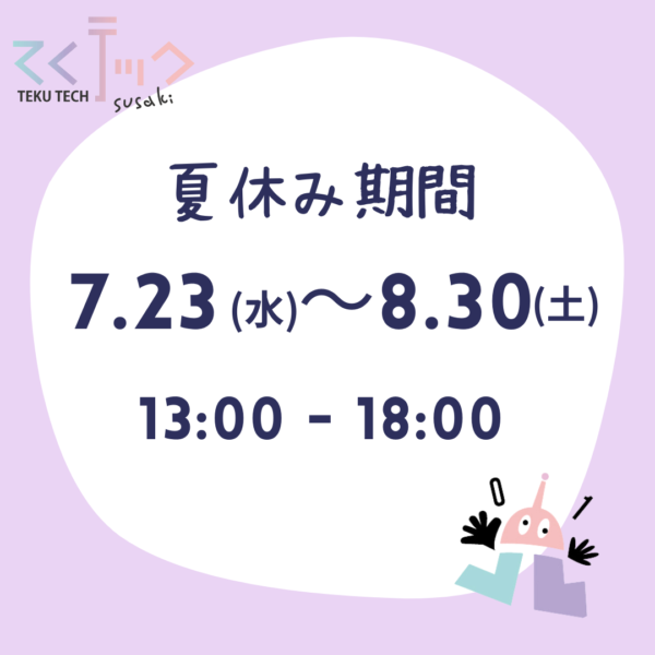 【てくテックすさきよりお願いです】 初回来館時はご予約を優先とさせていただきます。 夏休み中、特に土曜日は来館者数の増加が予想されます。 予約なしでも対応はいたしますが、お待たせすることも多く […]